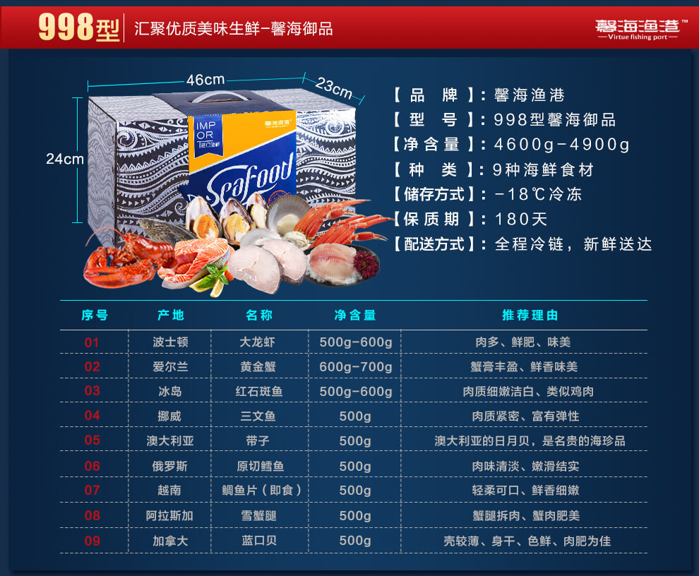 波士顿大龙虾,爱尔兰黄金蟹,冰岛红石斑鱼,挪威三文鱼,澳大利亚带子,俄罗斯原切鳕鱼,越南鲷鱼片,阿拉斯加雪蟹腿,加拿大蓝口贝.