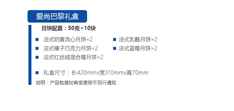 含奶黄流心,乳酪月饼,榛子巧克力,蓝莓,红丝绒混合莓等,共10块